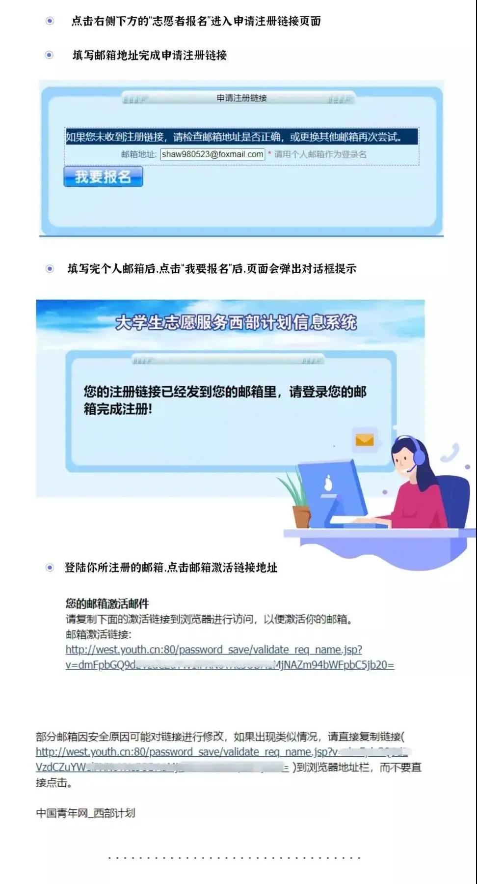即日起至5月20日,2021年普通高等学校应届毕业生或在读研究生可通过微信公众号“西部志愿汇”(菜单栏中的“我要报名”)或登录西部计划官网(http://xibu.youth.cn),在西部计划报名系统中进行注册报名。有关招募事宜以西部计划全国项目办后续发布的《2021年大学生志愿服务西部计划招募公告》为准。